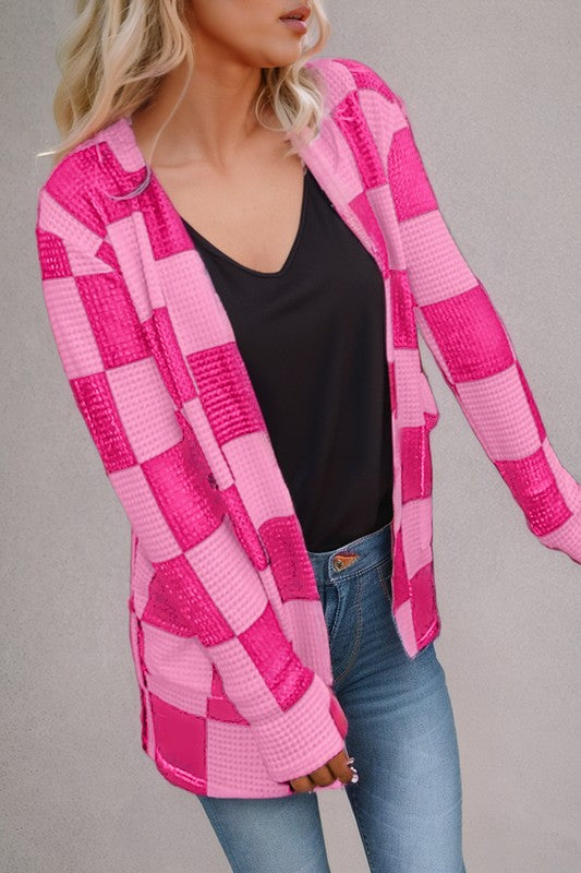 Checkered Waffle Knit Thumbhole Open Cardigan
