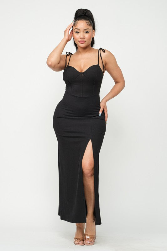 Corset Style Shoulder Tie Side Slit Maxi Dress
