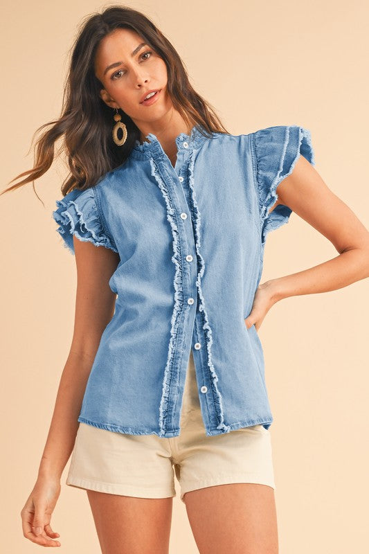 Button Front Ruffled Flutter Frayed Denim Top