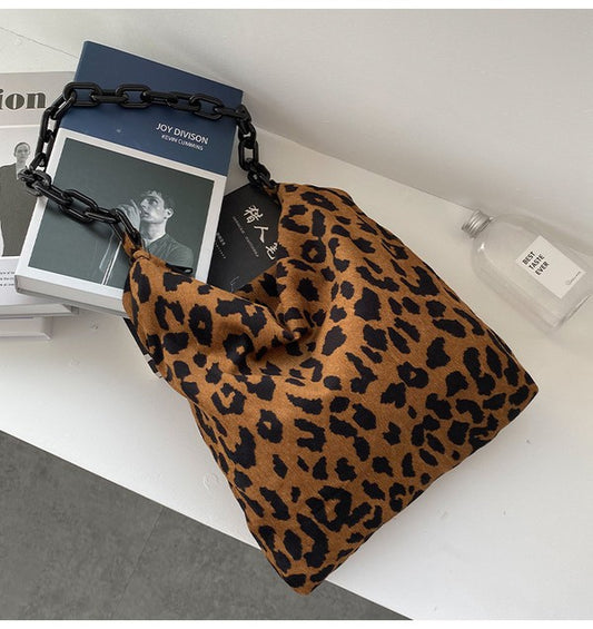 Leopard Print Corduroy Shoulder Tote with Chain Strap