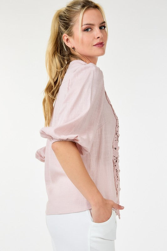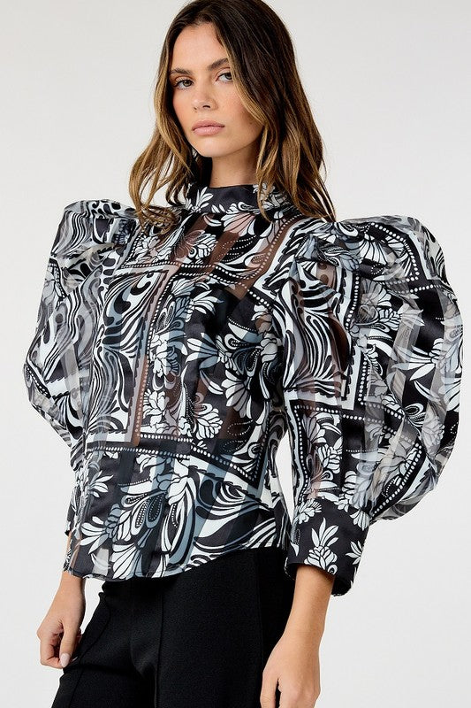 Black Bubble Sleeve Mock Neck Printed Blouse