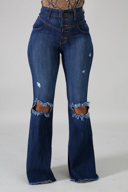 High Rise Dark Wash Bell Bottom Ripped Jeans