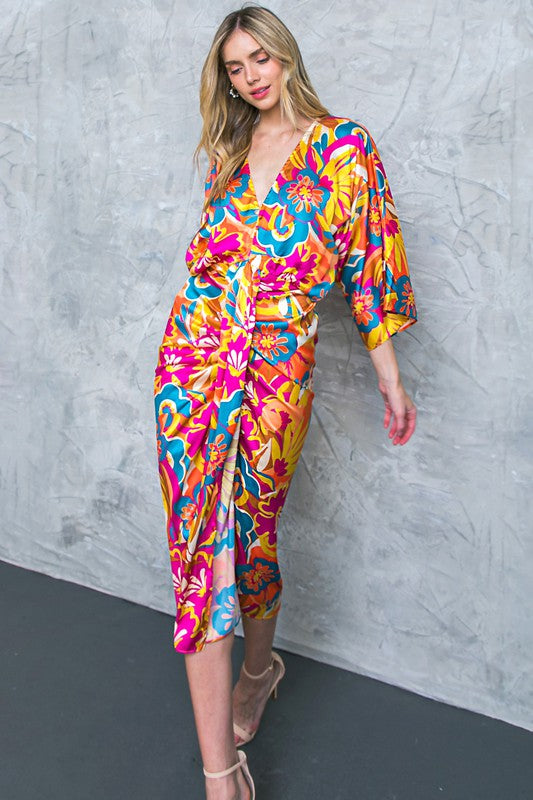 Women's Printed Satin V-neck Midi Dress