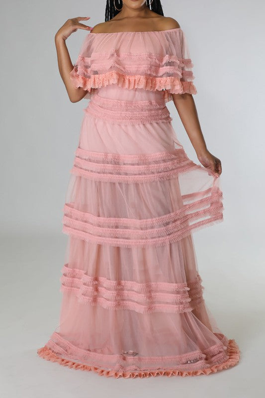 Off Shoulder Sheer Ruffle Tiered Mini Dress