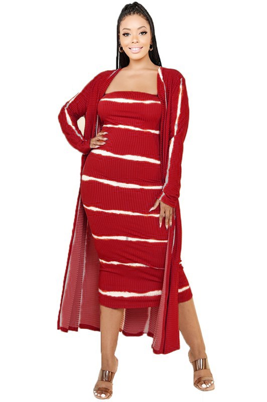 Plus Size Tie Dye Stirpe Long Cardigan Tube Dress Set