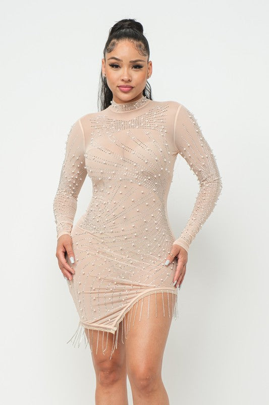 Women's Mesh Pearls Studs Detail Bottom Fringe Hem Dress