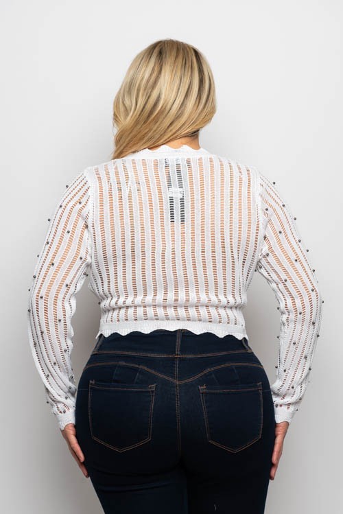 Plus Size Mesh Rhinestone Mock Neck Back Keyhole Long Sleeve Top