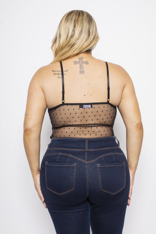 Plus Size Mesh Black Deep V Lace Trim Detail Bodysuit