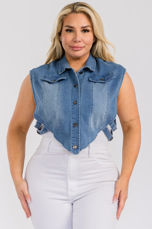 Plus Size Denim Collared Button-Down Crop Vest Top