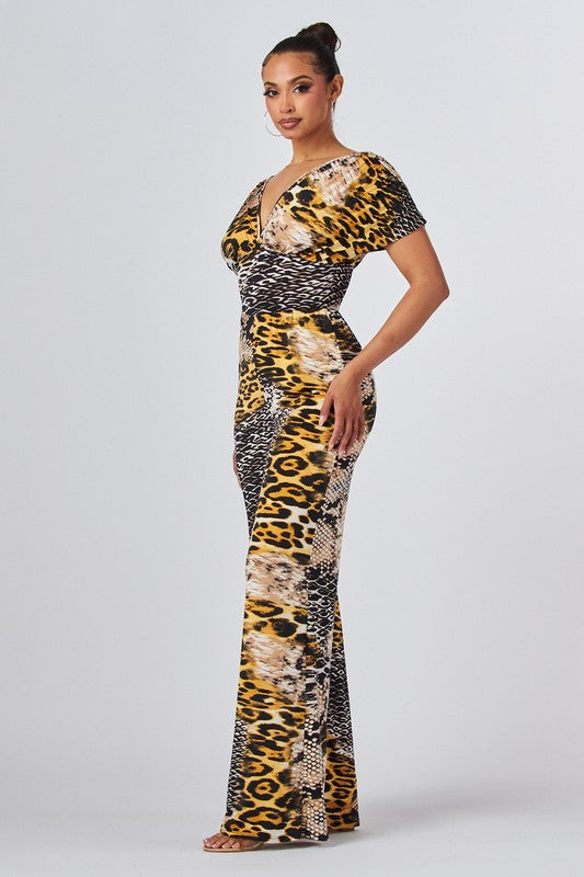Women's Animal Printed V Neck Jumpsuit with Open Back