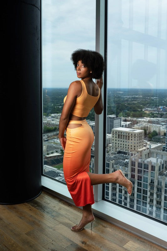 Very Thick Set! All eyes on you in this satin body-hugging Alma Set. Styled with a sexy square neck and cut-out detail on a ribbed hugging bodice, this Alma Set is sure to turn heads. Perfect for the vacation with your boo and giving a chic beach-worthy look. This dreamy dress comes in a maxi length and three sizes with a jaw dropping deep orange contrast.