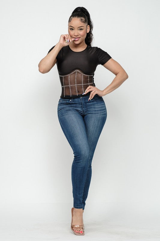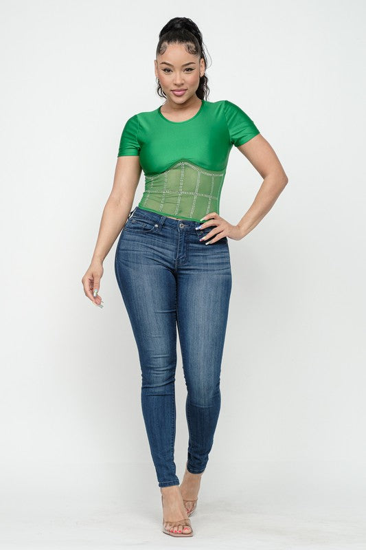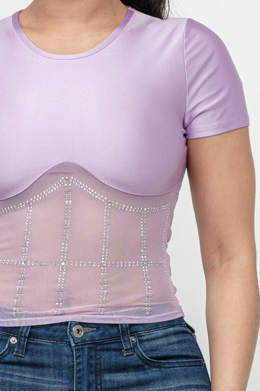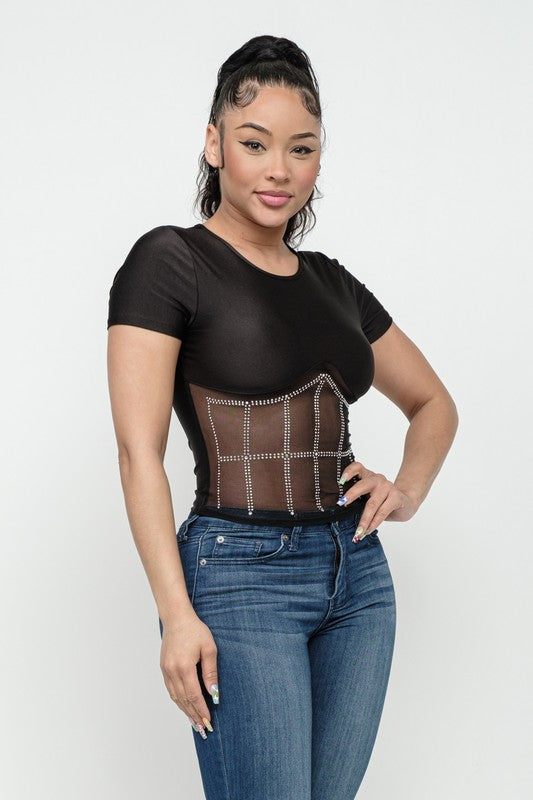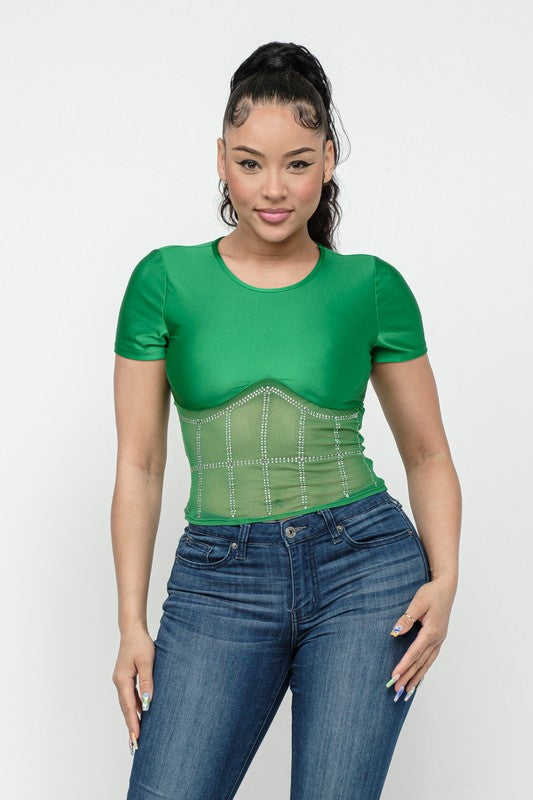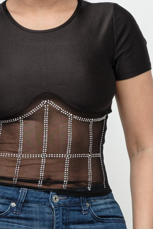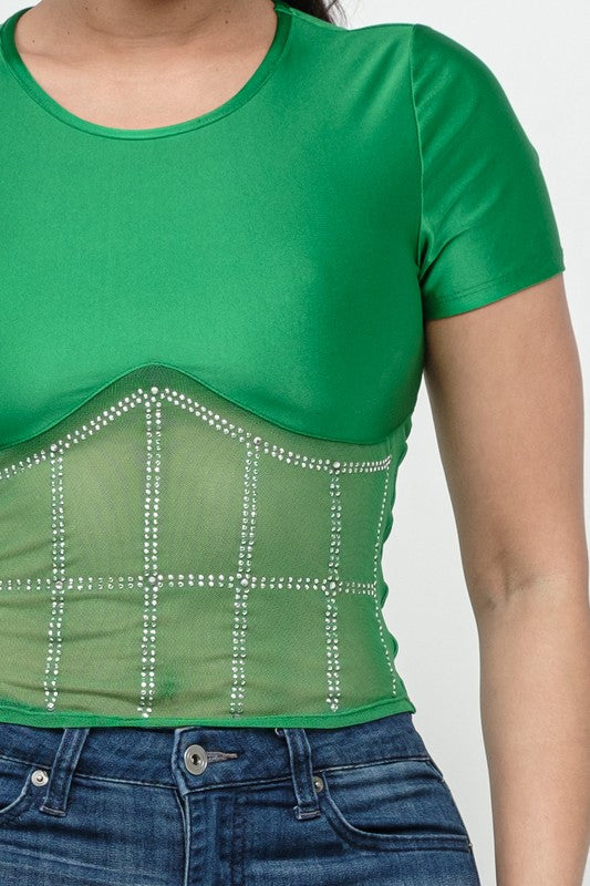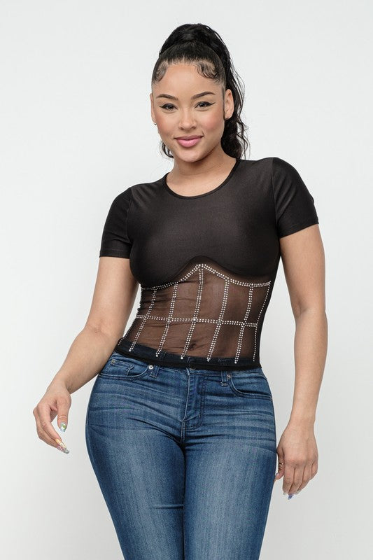 Front Studs Embellished Detail Contrast Mesh Top
