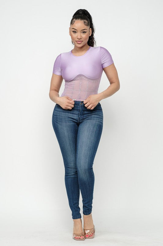 Shiny Yoga Fabric Round Neck Front Studs Embellished Detail Contrast Mesh Short Sleeve