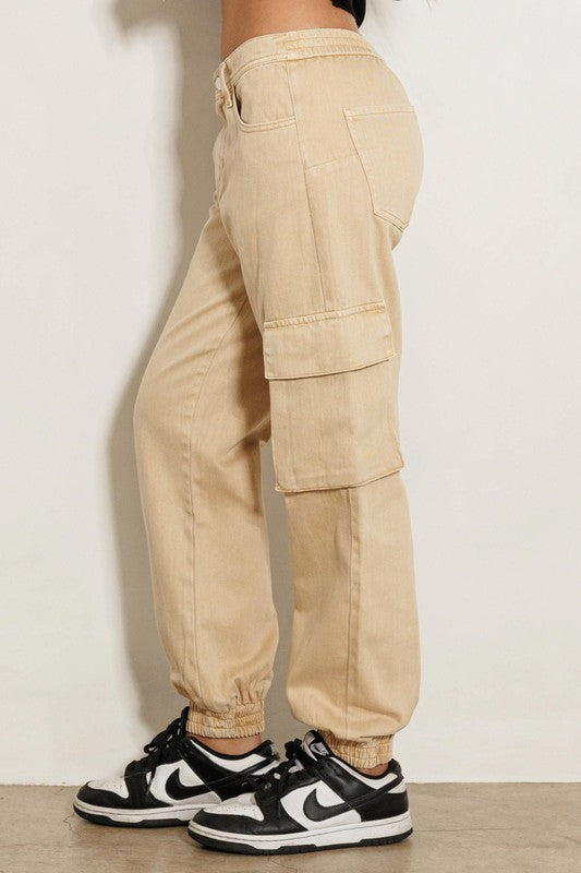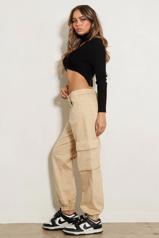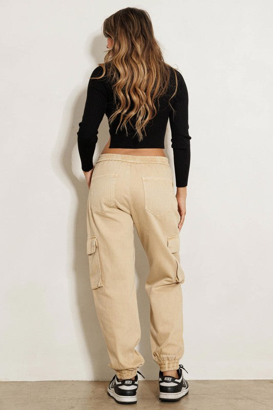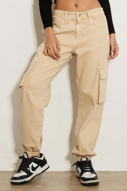 A pair of high-rise cargo jeans featuring wide cargo pockets, elastic leg openings, classic 5-pocket construction and zip-fly closure.