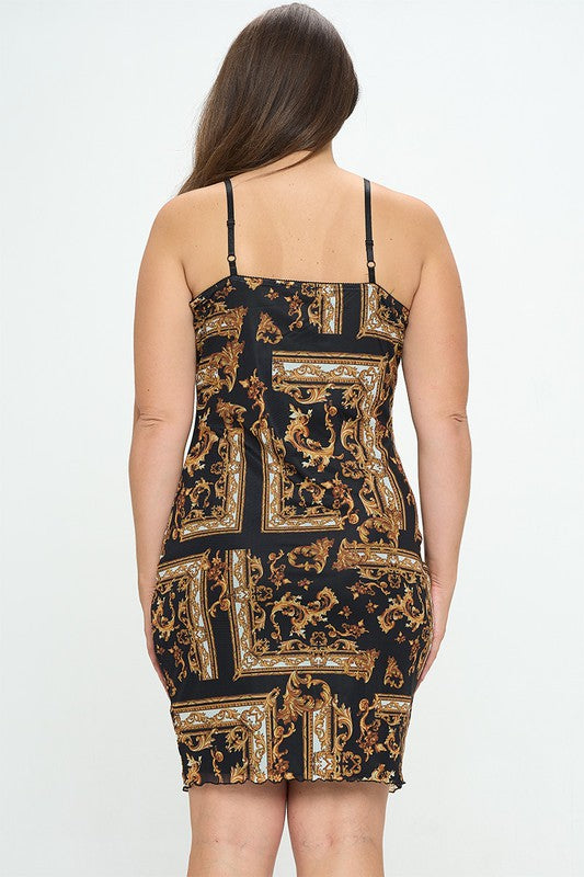 Junior Plus Size Baroque Inspired Print Bodycon Sheer Mesh Dress
