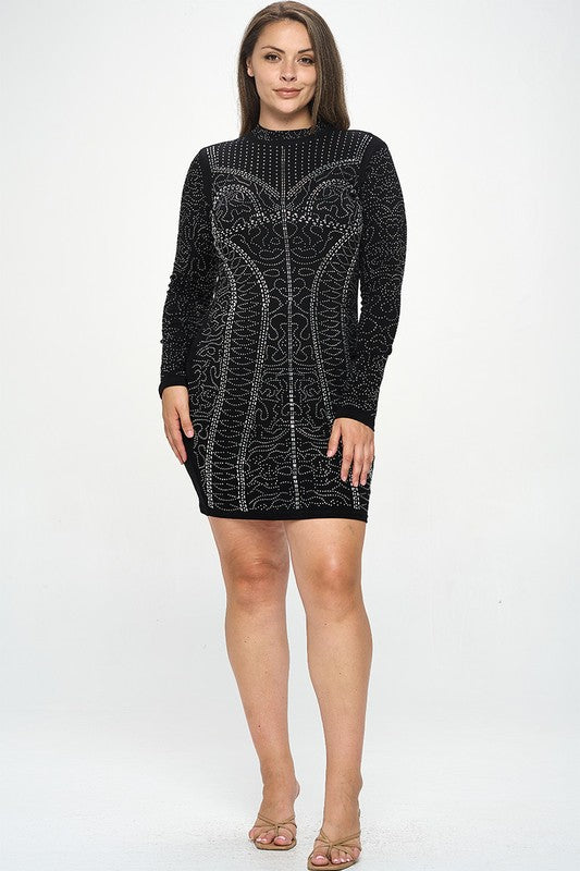 Junior Plus Size Rhinestone Long Sleeve Bodycon Dress