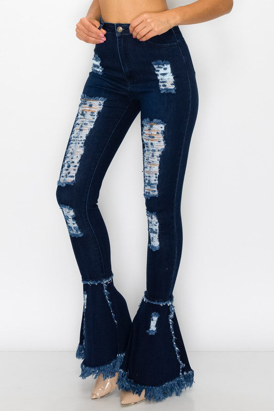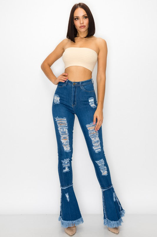 Description: DETAIL - FABRIC: STRETCH - High RISE WITH ZIPPER FLY - FLARE JEANS SIZE + FIT - FRONT RISE: 10 1/2 - INSEAM: 34.5 Fabric: 68% COTTON, 15% VISCOSE, 15% POLYESTER, 2% SPANDEX