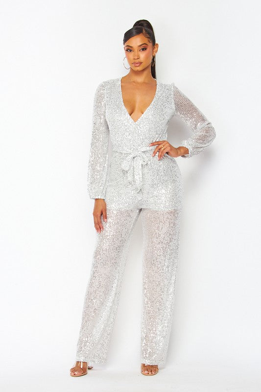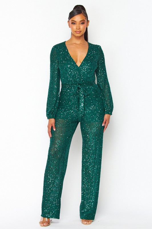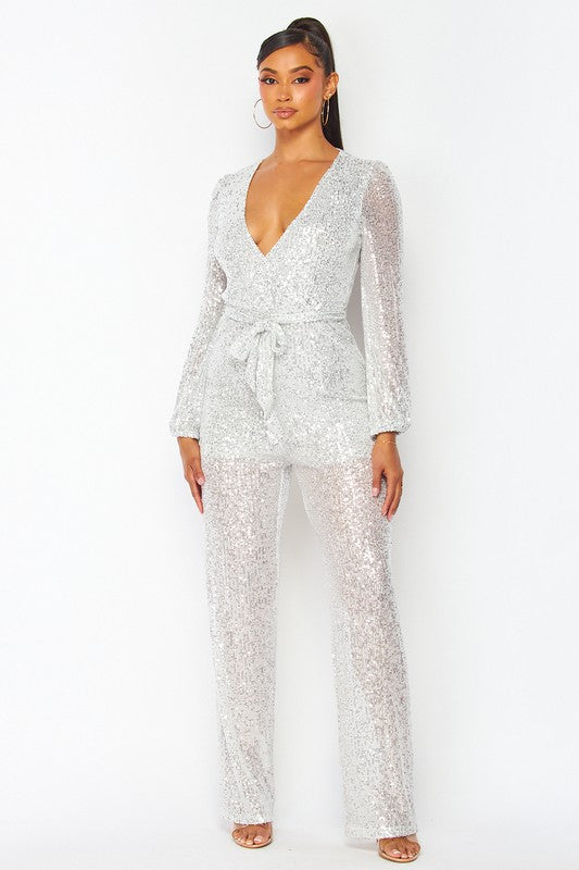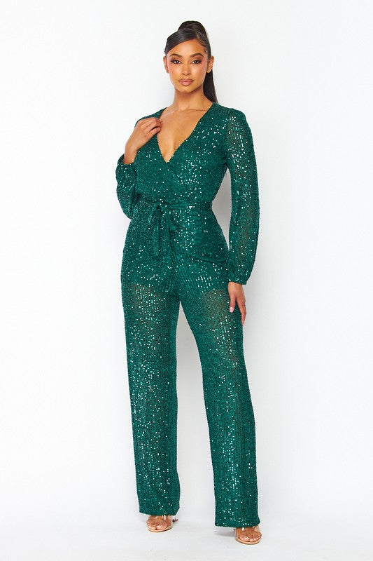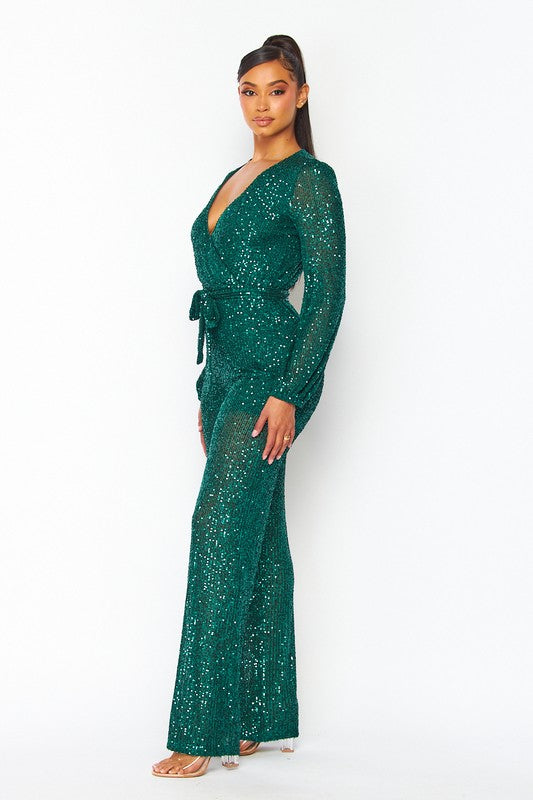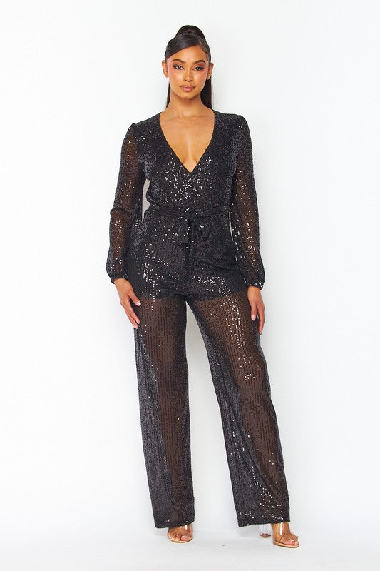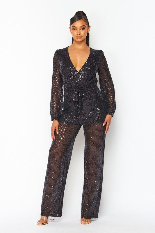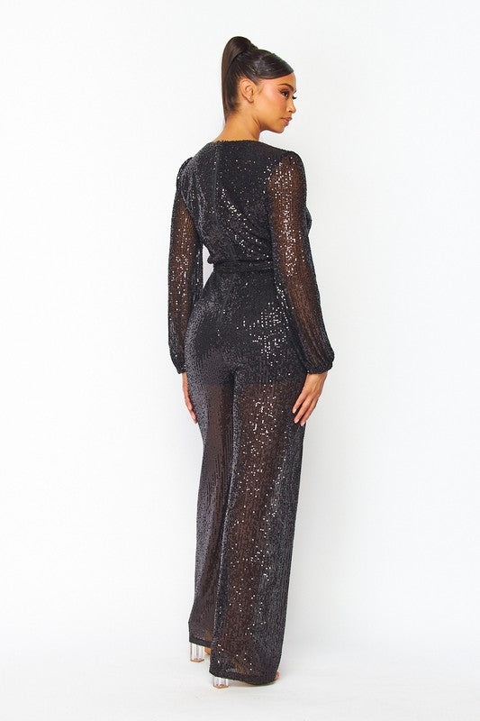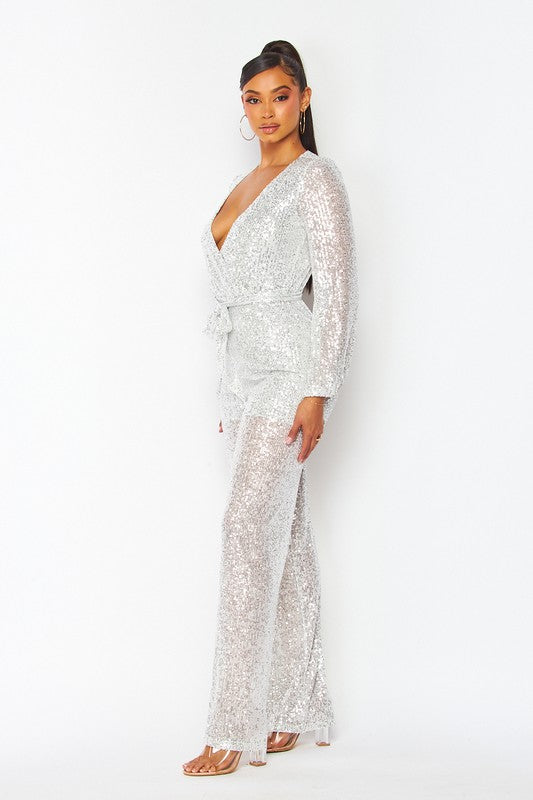 Long Sleeved Sequins Jumpsuit with Self Tie Belt