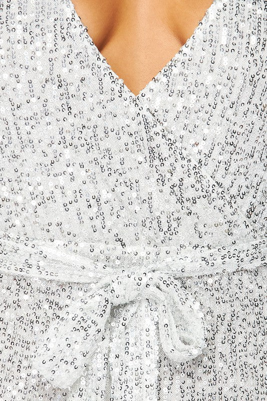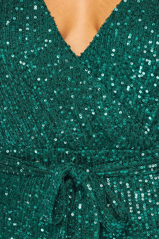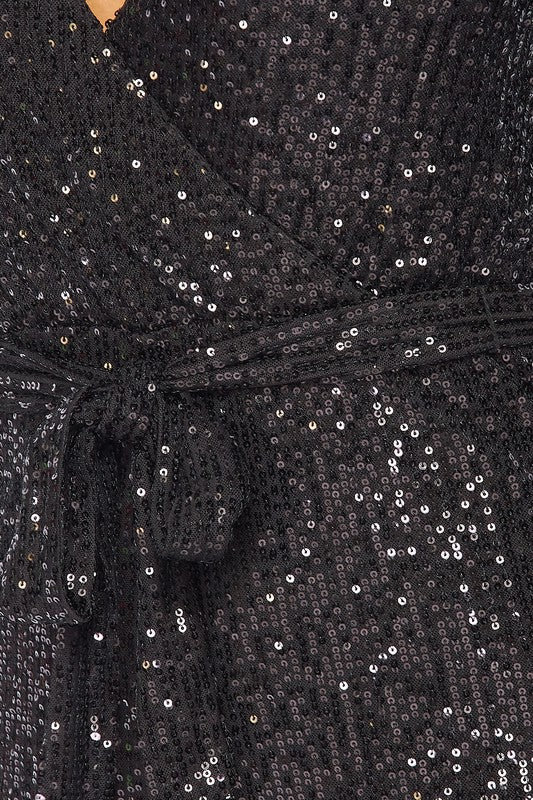 -Long sleeved sequins jumpsuit with self tie belt -Zipper opening in the back -Fully lined on bodice and with shorts on the bottom -No lining on sleeves -Great stretch and true to size
