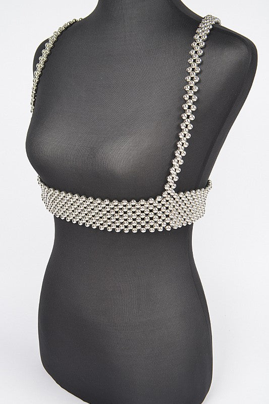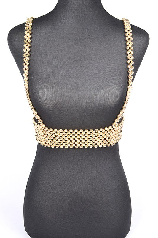 Elevate your style with our luxurious Metallic Beaded Harness Belt. Handcrafted with intricate beadwork, this belt adds a touch of elegance and sophistication to any outfit. Perfect for cinching the waist or draped over the shoulders, this belt will become your go-to accessory for a statement look.
