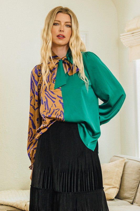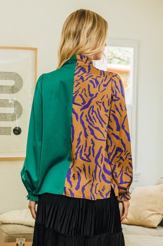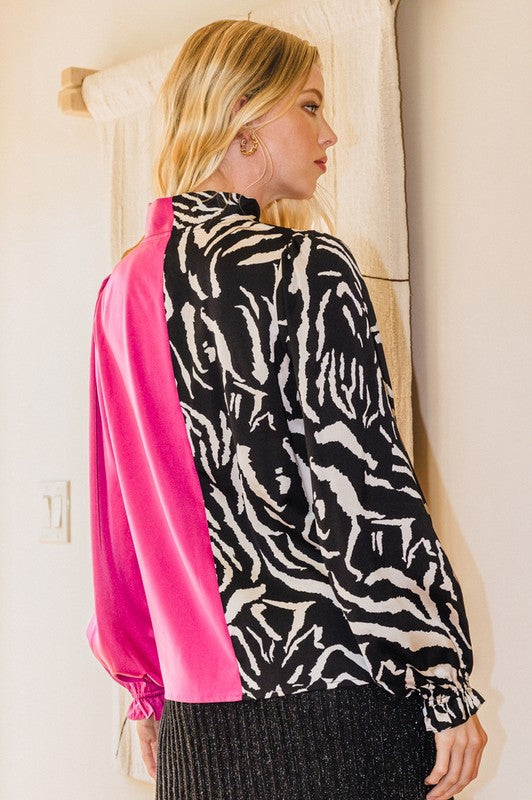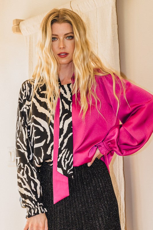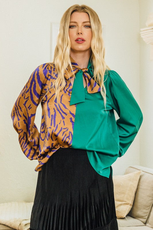 Cut a stunning silhouette in our Necktie Front Color Block Top. This is the perfect piece for the fashionista who appreciates the unique, offering a creative blend of solid and zebra print on a luxurious cotton blend construction. The relaxed fit and long sleeves are designed to keep you comfortable and stylish all day long. Make a statement in this eye-catching top that exudes sophistication and exclusivity.