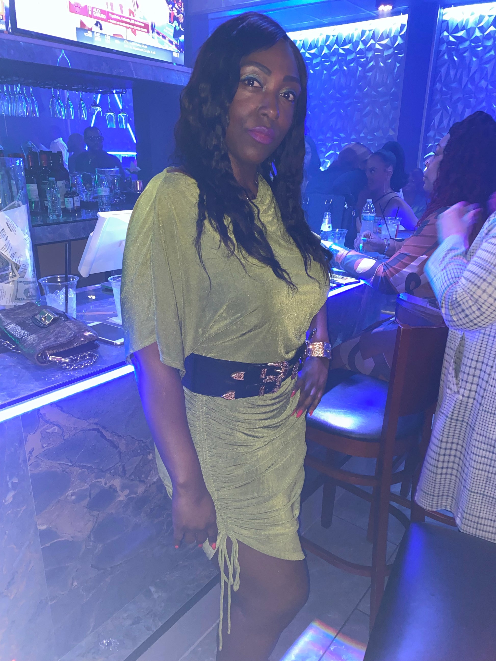 sleeves, side ruched with adjustable drawstrings. Model is wearing size 1XL. Height: 5 11" Waist: 34" Bust: 43" Hips: 44"