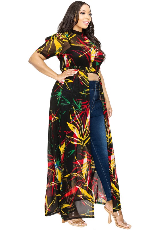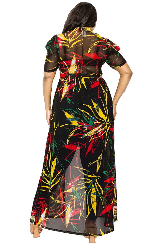 Plus Leaf Mesh Print See-through Maxi Dress