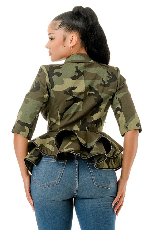 Plus Size Camouflage Peplum Ruffle Hem Blazer