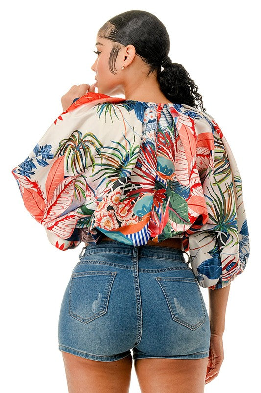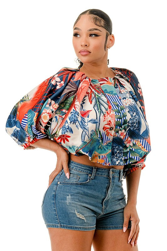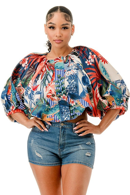 Plus Size Clothing Round Neck Balloon Short Sleeve Front Zip Bubble Cropped Top