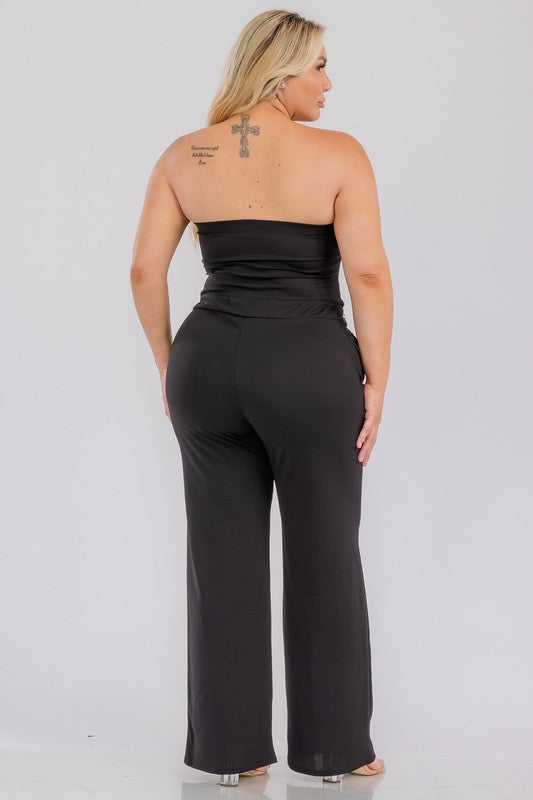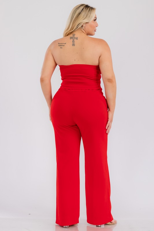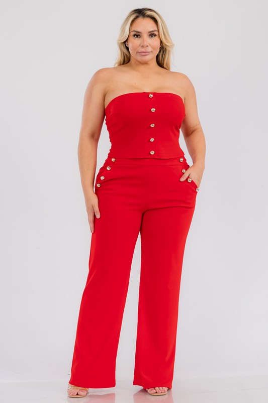 Elevate your style with our Plus Size Crop Tube Top and Wide Leg Button Detail Pants Set. Perfect for any occasion, this set features a crop top that flatters your figure and wide-leg pants with button detailing for a touch of sophistication. Don't compromise on comfort or style, this set has got you covered.