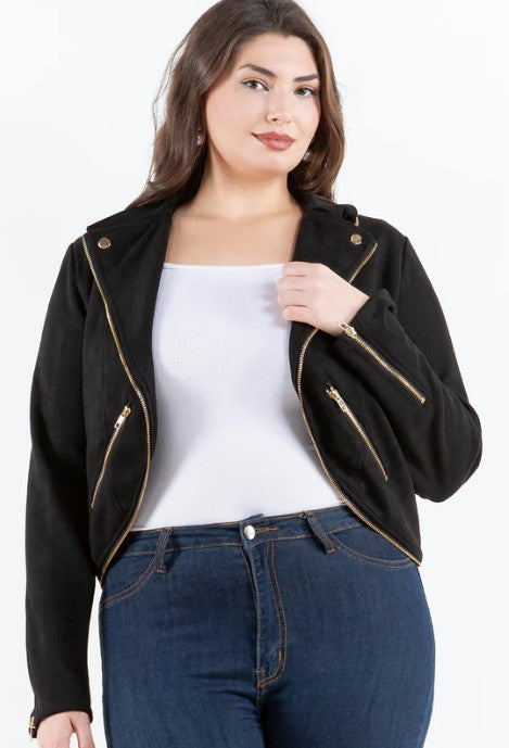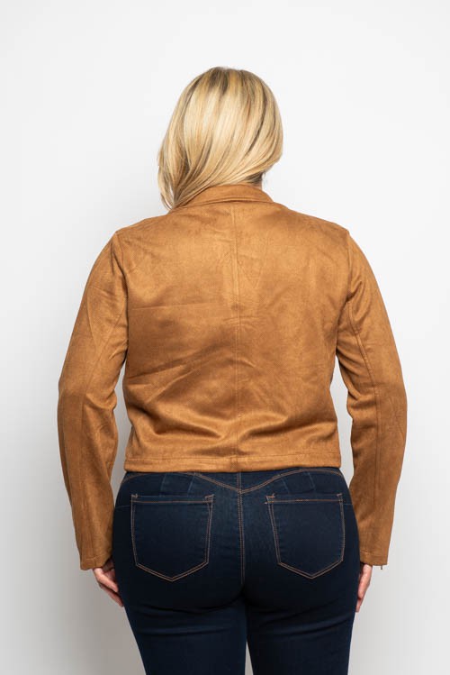 This plus size faux suede jacket will add a touch of luxury to your wardrobe. With a flattering cropped cut and zipper details, this jacket is both stylish and practical. The open front and collared neckline make it perfect for layering over any outfit. Stay warm and fashionable this season with this must-have jacket.