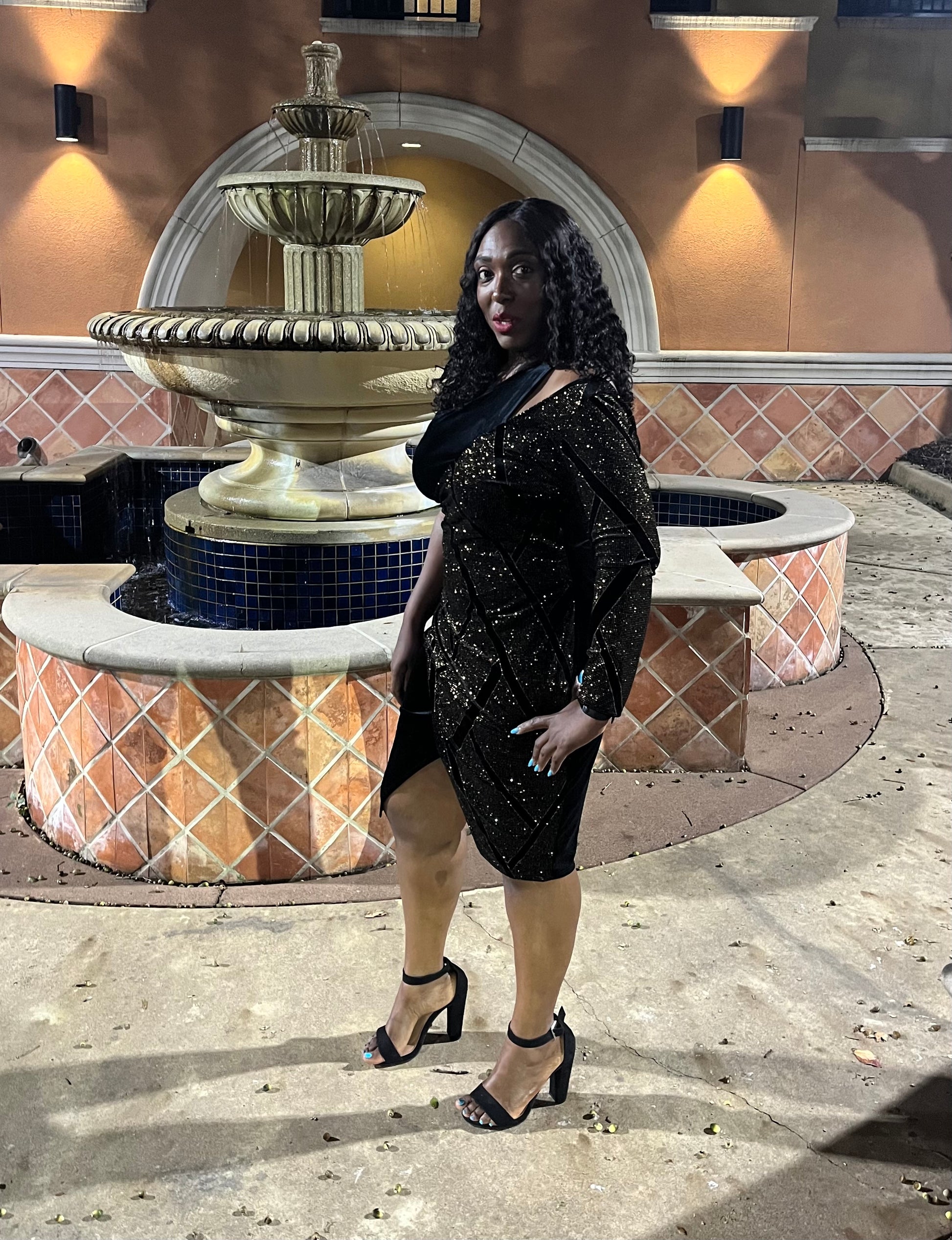 This Plus Size Gold Glitter Contrast One Shoulder Tulip Midi Dress captivates with its glamorous appeal. Perfectly tailored for the modern curvy woman, it features a gold glitter contrast and a single shoulder in a tulip design to bring a touch of luxury to your wardrobe. An exquisite garment to make you stand out in any occasion.