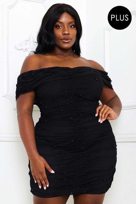 Plus Size Shirring Centered Pearl Beaded Open Shoulder Mini Dress