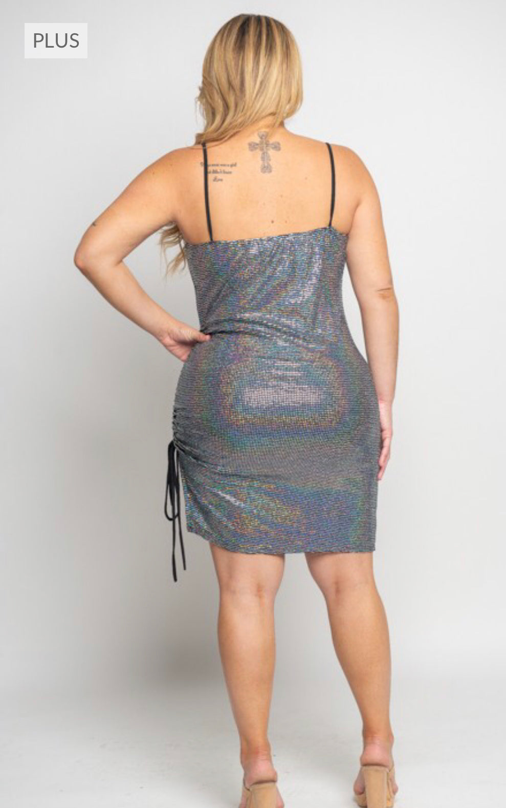 Plus Size Sliver Glitter Spaghetti Strap Midi Ruched Side Dress