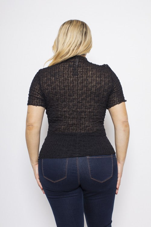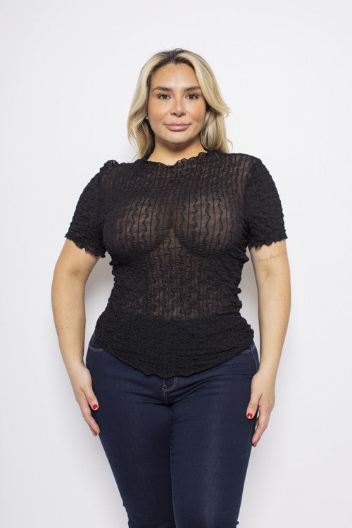 Plus Size Textured Mesh Short Sleeve Lettuce Trim Top