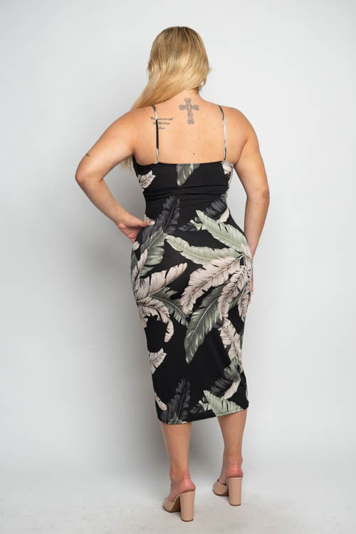 Plus Size Tropical Print Slit Midi Bodycon Cami Dress