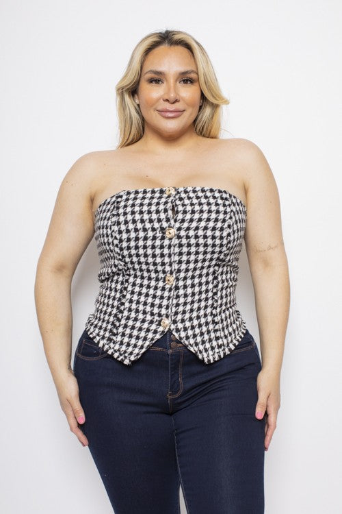 Plus Size Tweed Houndstooth Button Down Fitted Corset Top