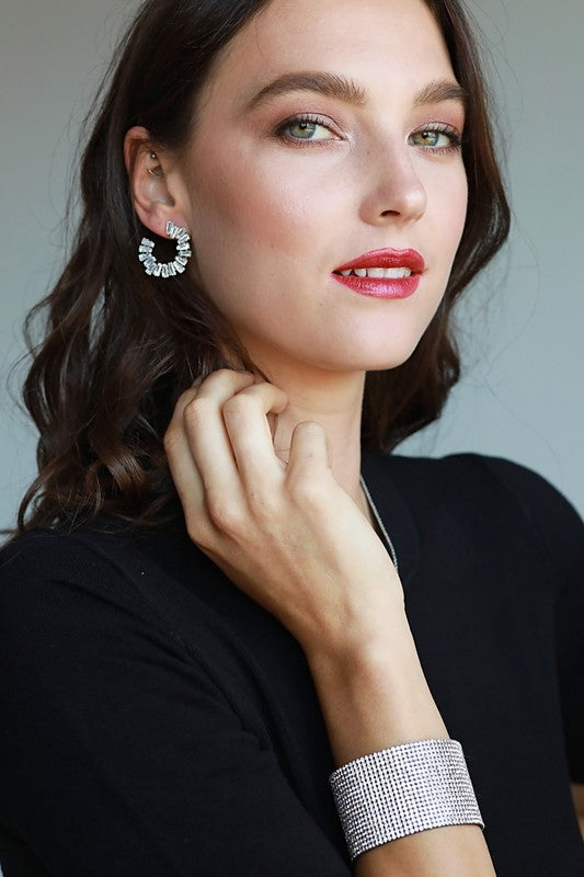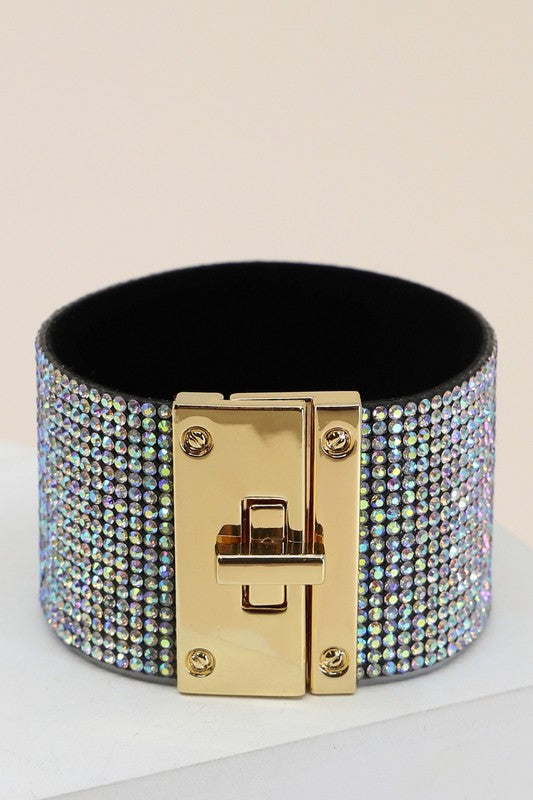 Rhinestone embellished lock closure cuff bracelet with soft faux suede interior. Shine all day and night with this crystal covered piece! APPRX. 1 1/2 in wide, 7 1/2 in long Materials: Faux Suede Rhinestones