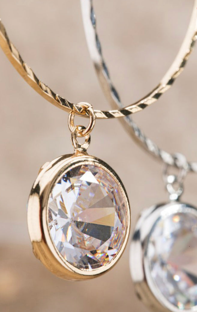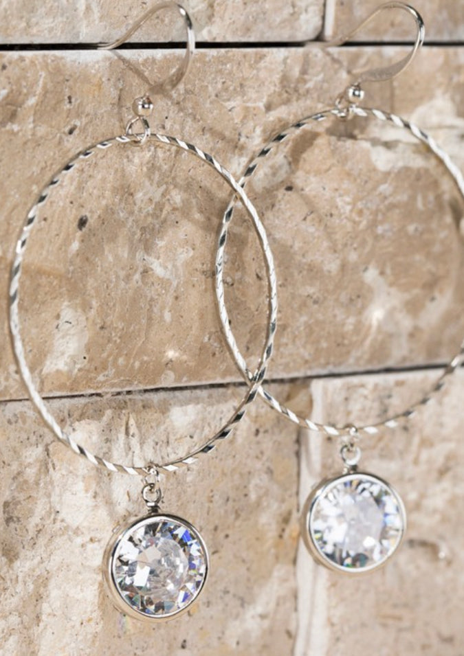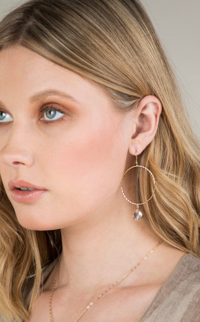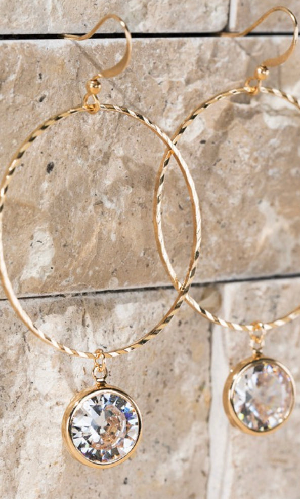 Textured metal ring with shimmering crystal charm dangle fish hook earrings *Metal, Glass *Lead/Cadmium Compliant *APPROX. L 2.25" W 1.5"