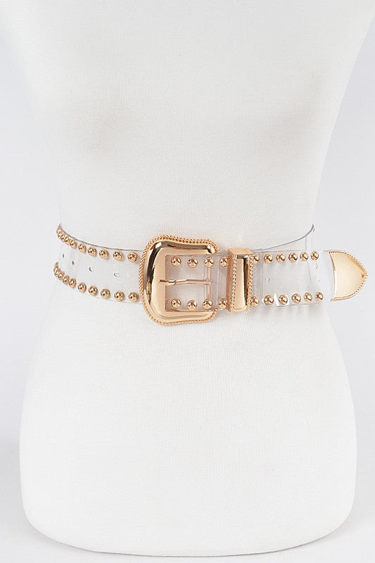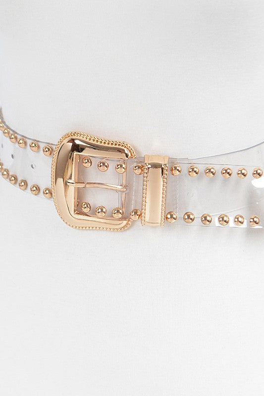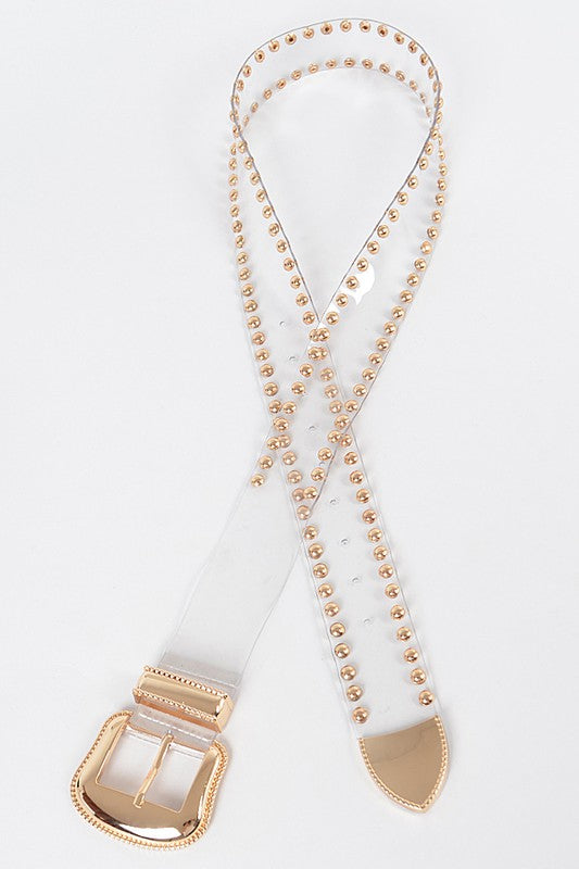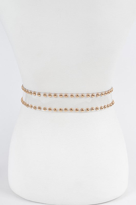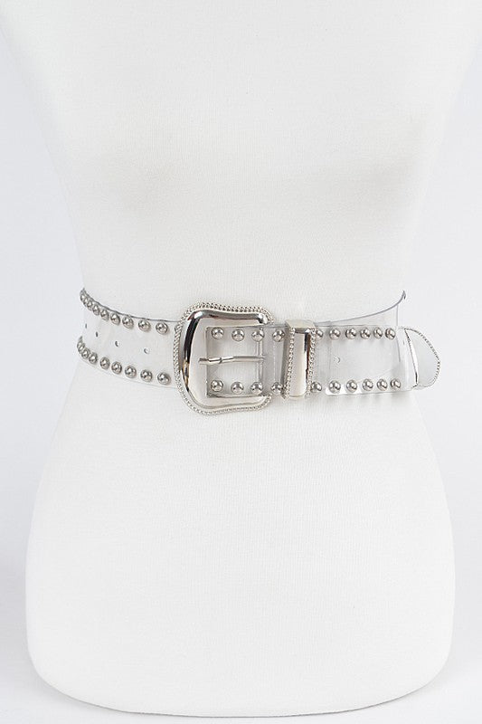 Feel like you're walking the red carpet with this unique sheer, studded belt! Show off your fashionista attitude with this see-through stunner and turn heads when you belt up! Sparkle and shine with stylish edge.