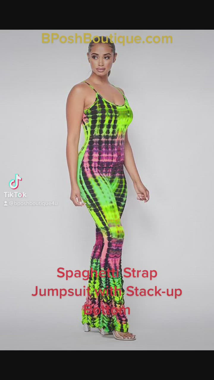 -Spaghetti strap jumpsuit with stack-up bottom -Very soft hand with great stretch -True to size -Model is 5'7" and she is wearing a size S
