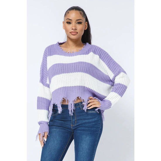 Stripe Knit Distressed Cozy Sweater With its unique design and super-soft material, this sweater will keep you warm and looking stylish—a cozy win-win!