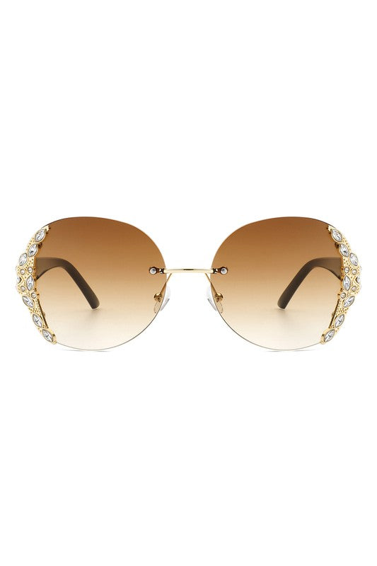Women Rimless Round Rhinestone Oversize Sunglasses