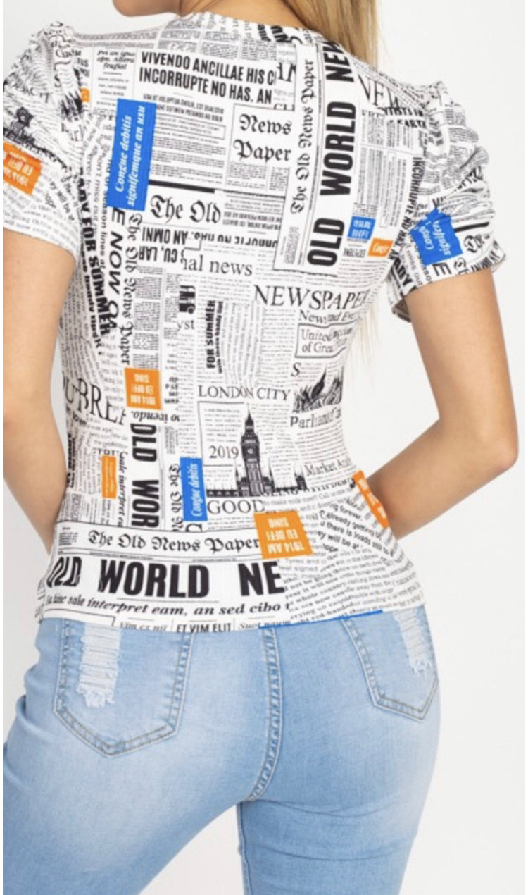 A knit shirt featuring an allover newspaper graphic print, a round neckline, ruched short sleeves, a fitted silhouette, and a waist length.