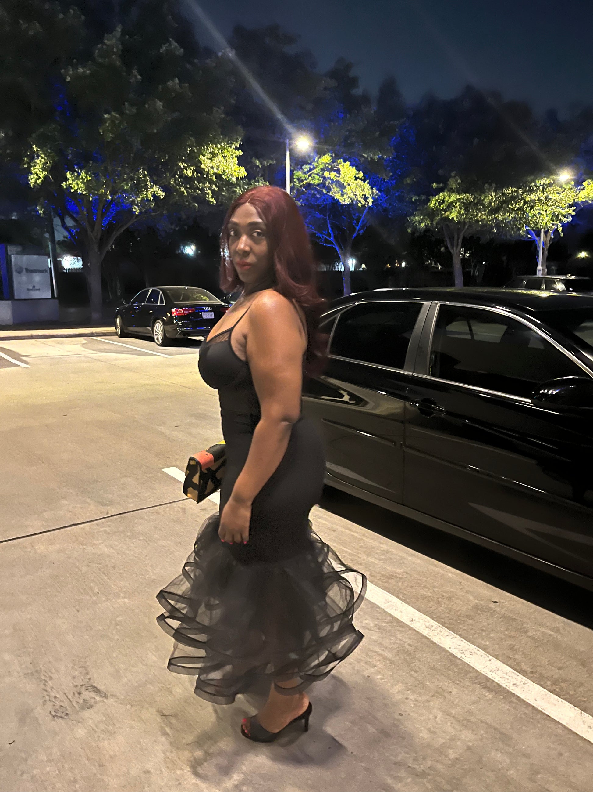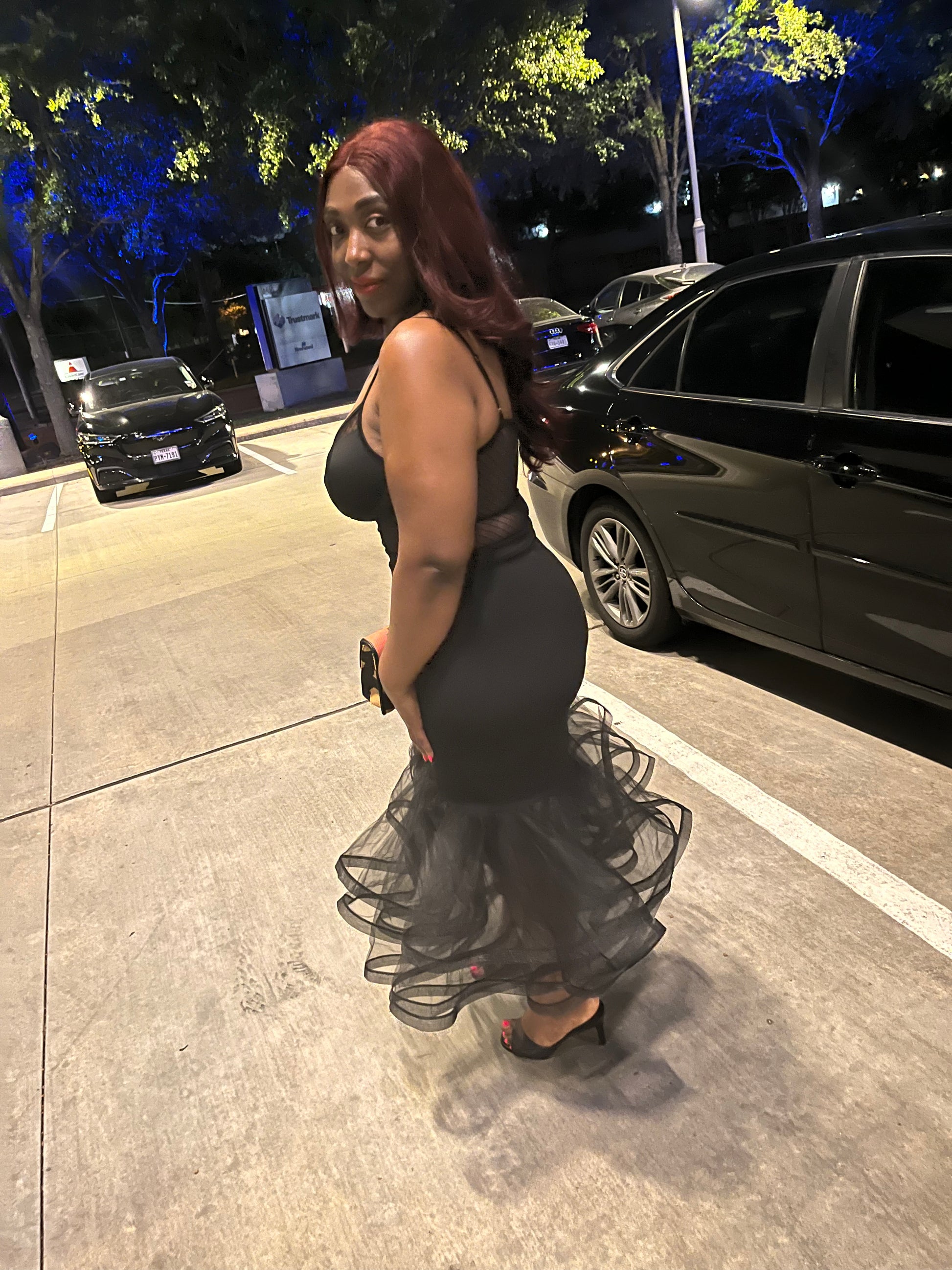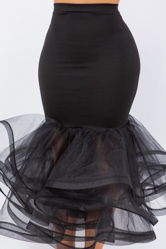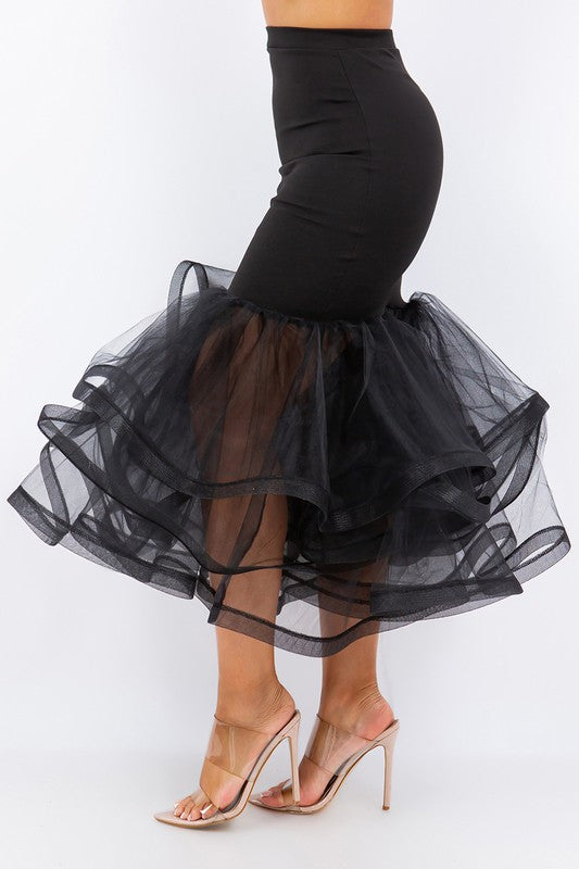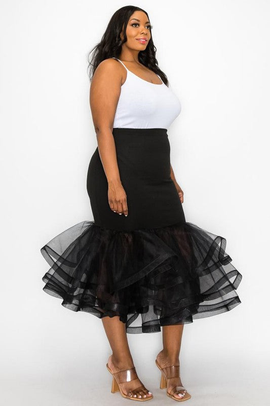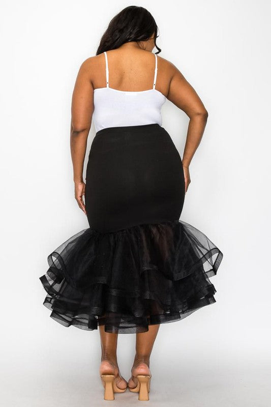 Plus Size Black Solid Tiered Layers Midi Mermaid Skirt