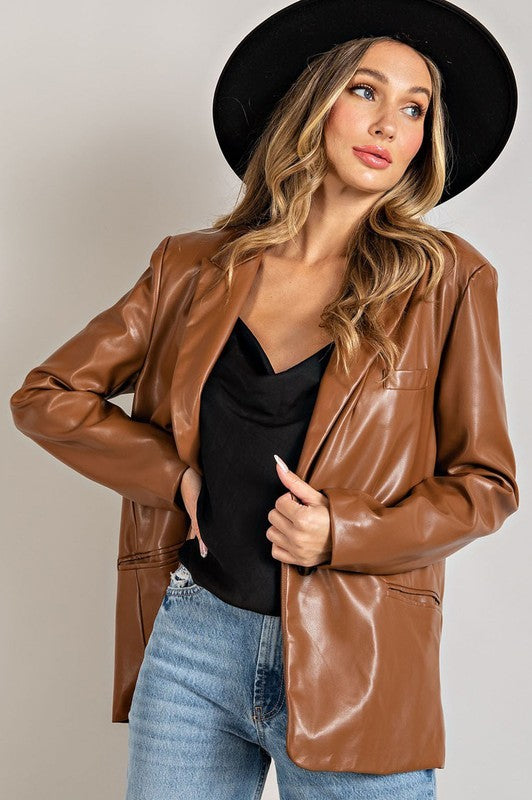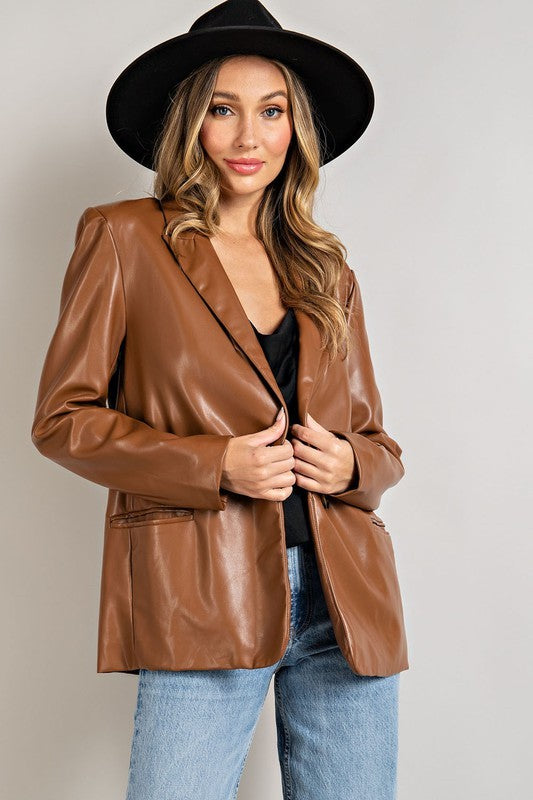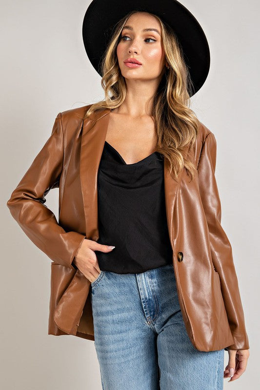 This Women's Faux Chic Leather Blazer is the perfect piece for bringing a touch of modern luxury to any ensemble. Crafted from high-quality faux leather in a sleek, sophisticated silhouette, this tailored blazer adds a timeless yet contemporary charm to any wardrobe. Its expertly designed construction ensures lasting comfort and an effortless, graceful look.