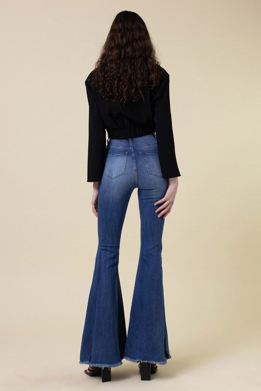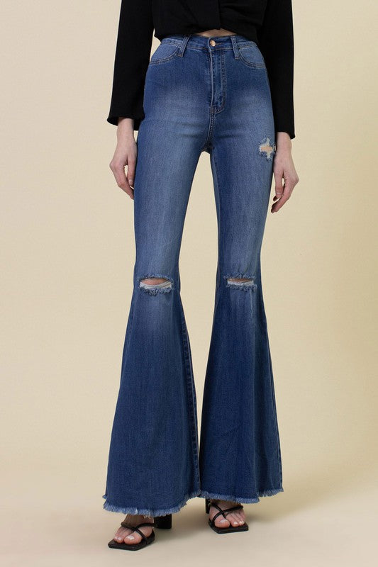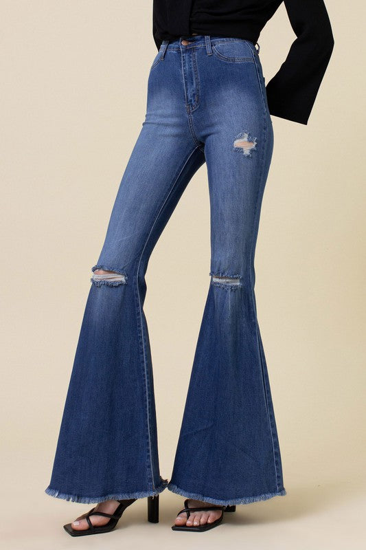 A pair of extreme flare jeans featuring a light distressed design, frayed raw hem, and ripped knee slits. These jeans offer two back patch pockets, faux front pockets, and a zip fly closure.