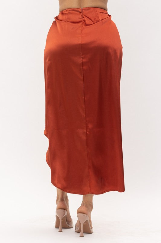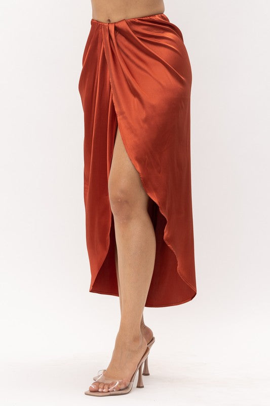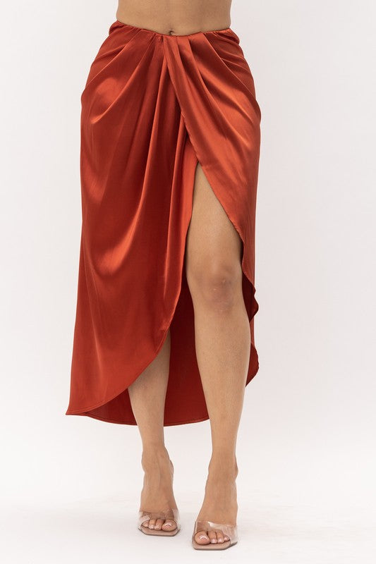 Women's Satin Open Front Ruched Wrap Flare Maxi Skirt