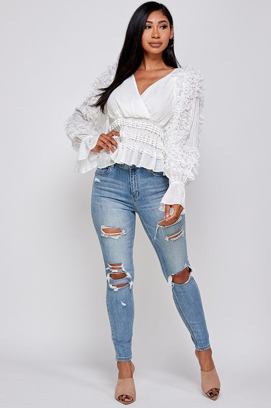 Women's Surplice Ruffled Long Sleeve Blouse Shirt -Smocked waist -Ruffled long sleeve -Surplice