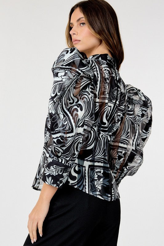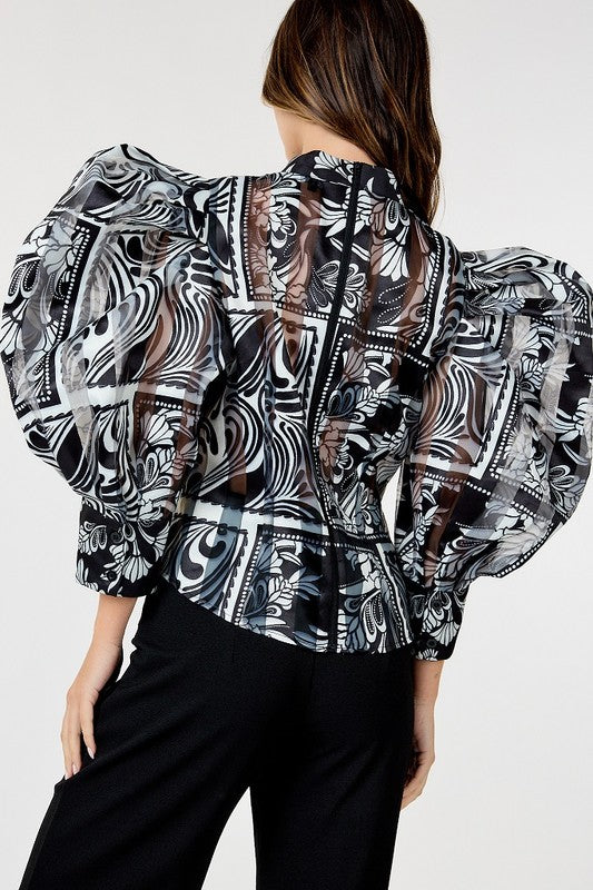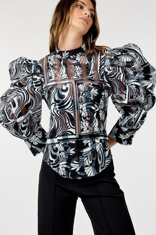 Black Bubble Sleeve Mock Neck Printed Blouse